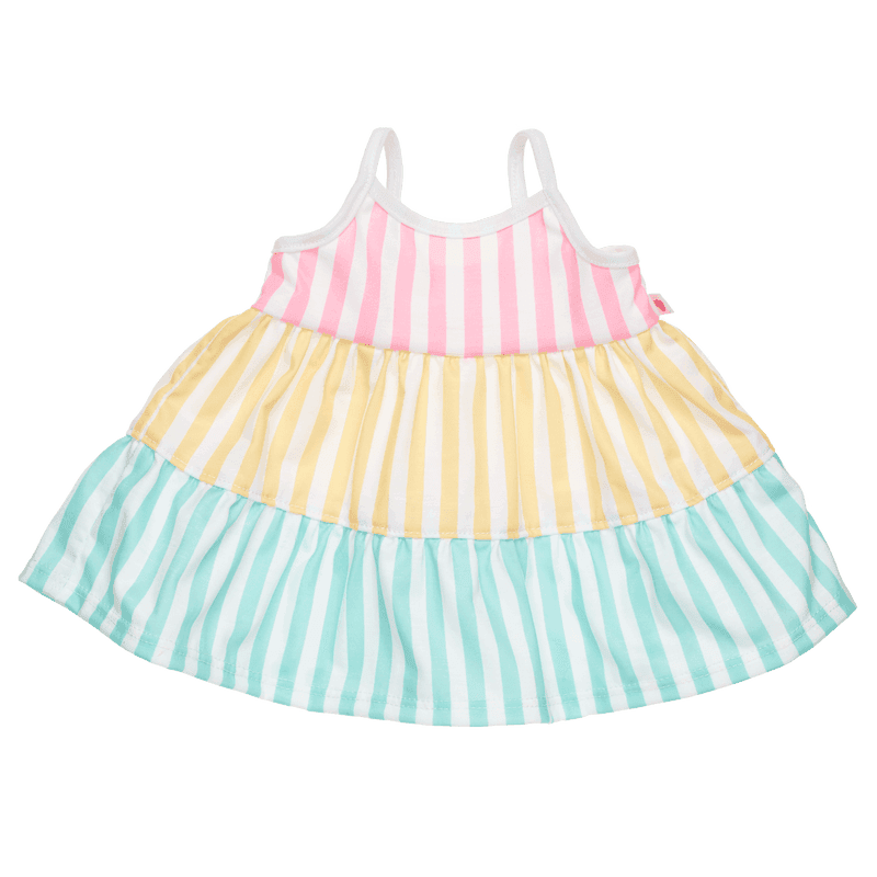 This adorable maxi dress for stuffed animals has three tiers of pink, yellow and blue stripes.